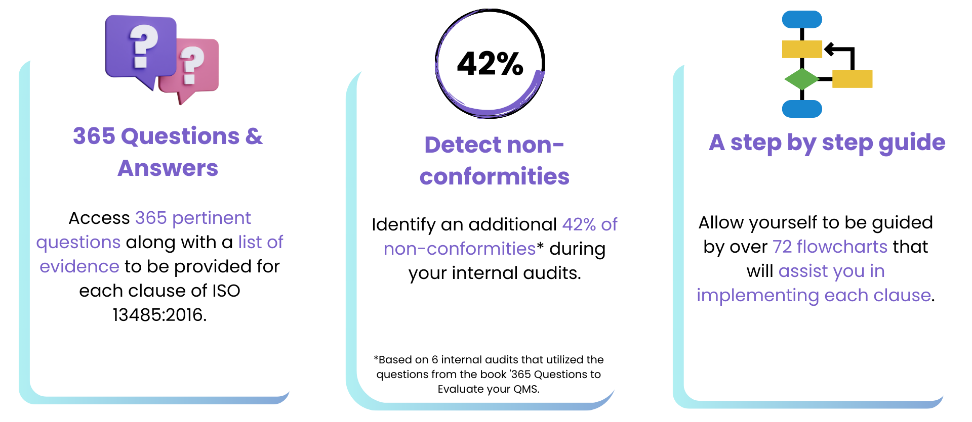 Regularly assess your QMS or conduct an internal audit using the 365 questions that cover the 72 clauses of ISO 13485:2016.