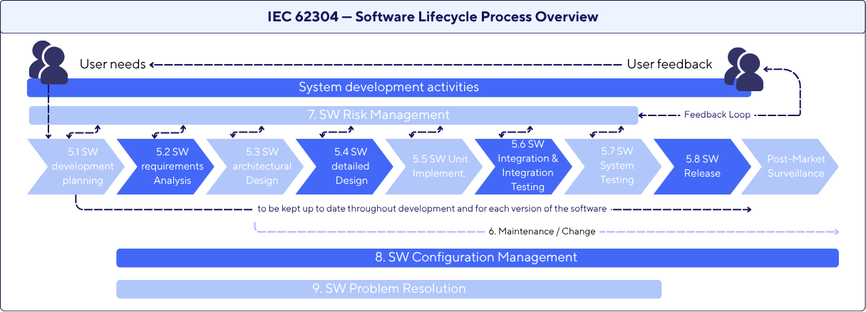 IEC 62304 defines the complete software lifecycle for medical devices from planning and requirements to release and maintenance.