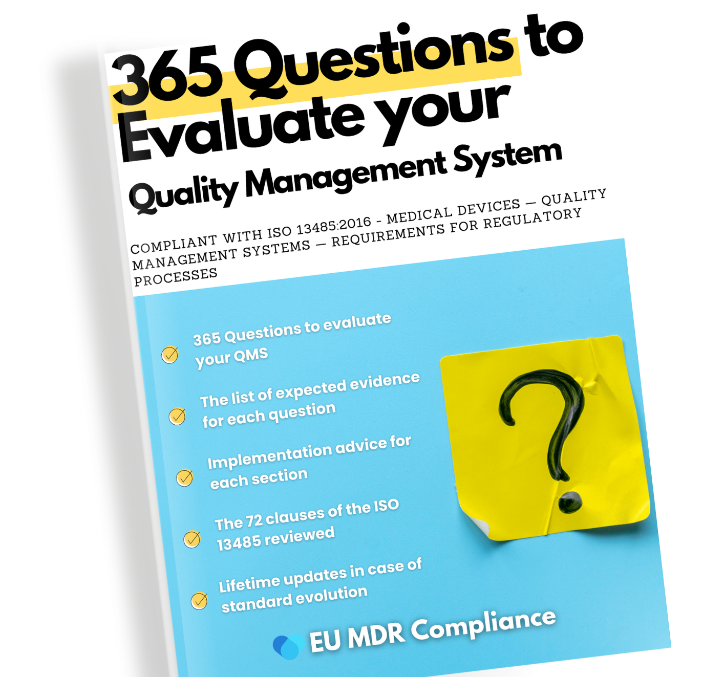 Evaluate your quality management system according to ISO 13485:2016 with these 365 routine questions, for internal audits or before your notified body audit. Find a list of expected documents for each question, as well as explanations for implementing each clause of ISO 13485:2016, illustrated with flowcharts. A must-have for evaluating your QMS.