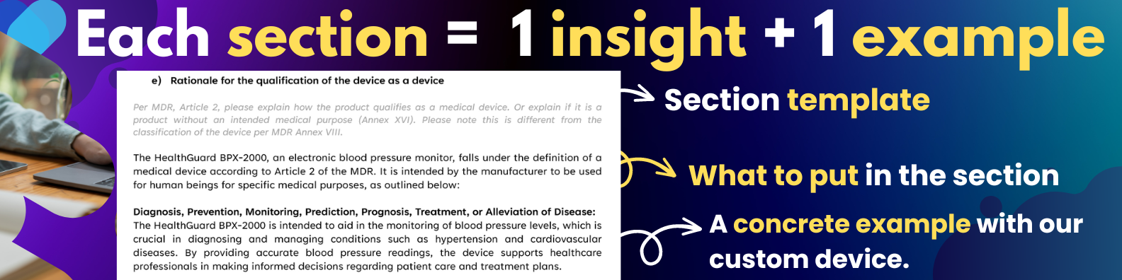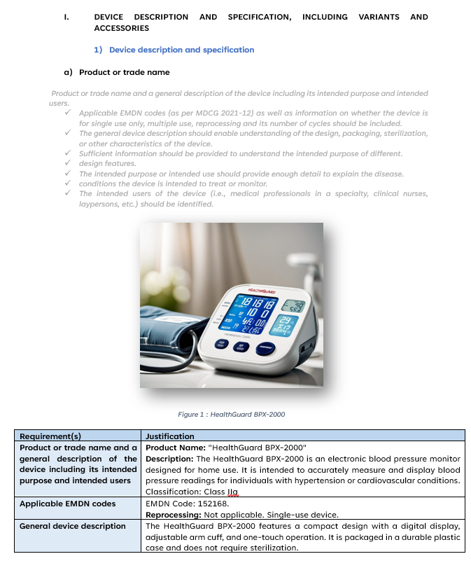 To immerse you fully and ensure completeness, our experts have crafted a fictitious medical device: "HealthGuard BPX-2000". What better way to derive inspiration than from an actual medical device, tailoring it to your needs or those of your clients?