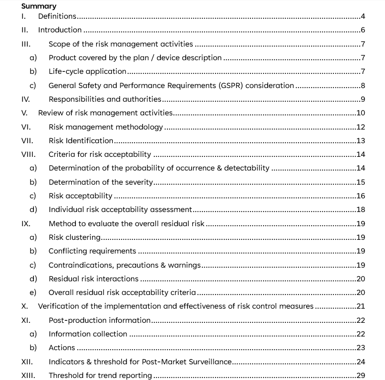 For each section required in the Risk Management Plan by ISO 14971:2019 you will find :