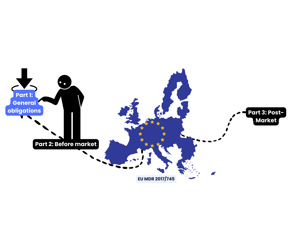 Part 1 covers essential requirements such as appointing a person responsible for regulatory compliance, ensuring financial coverage, implementing a Quality Management System (QMS), and establishing a regulatory intelligence system. Additionally, it discusses the importance of archiving, confidentiality, and cooperation with authorities and notified bodies.