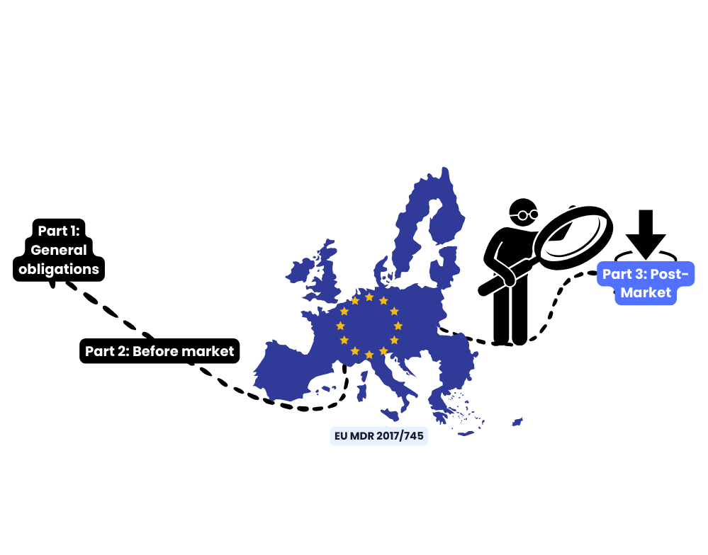 Part 3 focuses on post-market requirements for medical devices. It includes post-market surveillance (PMS), reporting incidents, trend analysis, and maintaining traceability of devices. The guide also emphasizes the importance of ongoing compliance, updating technical documentation, and cooperation with authorities for device safety and effectiveness.