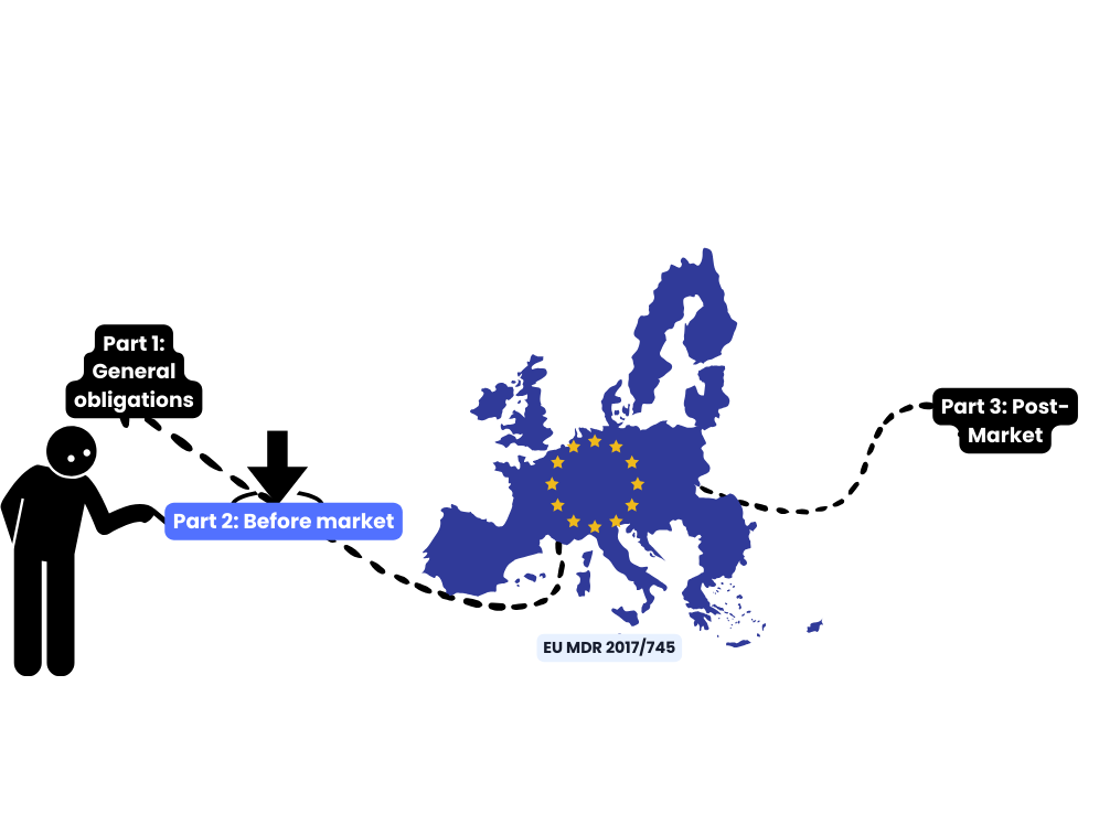 Part 2 covers the requirements before placing a medical device on the market. It includes product classification, risk management, clinical evaluation, and ensuring compliance with safety standards. Additionally, it outlines the need for technical documentation, UDI assignment, and conformity assessment procedures for CE marking.