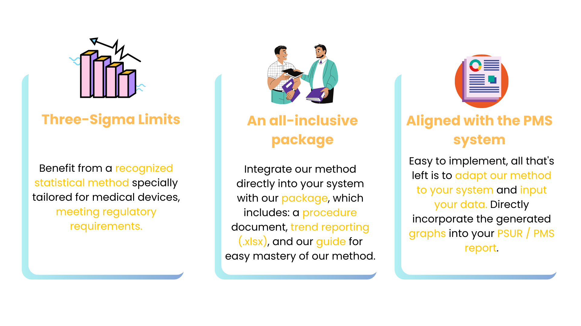 In partnership with a qualified statistician, we have developed a statistical method based on three-sigma limits tailored for post-market surveillance of MD & IVD to be directly integrated into your system.